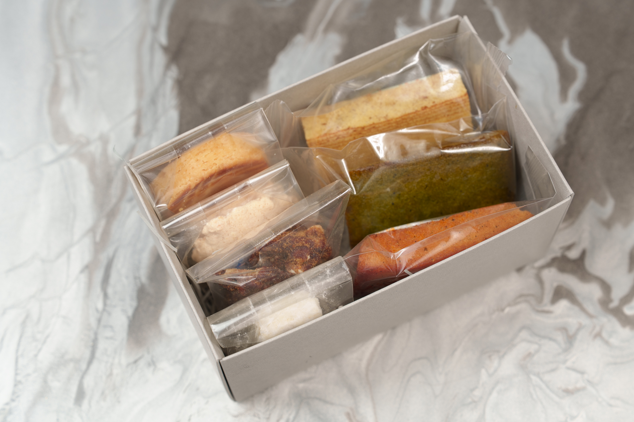 ① バウムクーヘンプレーン 卵(国産)、砂糖、ショートニング、マーガリン、小麦粉、米粉、コーンスターチ、洋酒、アーモンド加工品、生クリーム、乳等を主要原料とする食品/乳化剤、膨張剤、香料、酸化防止剤(VE)、pH調整剤、着色料(アナトー) (アレルゲン:小麦・卵・乳成分・アーモンド・大豆) ② フィナンシェ・プレーン ~またいちの塩~ 卵白(卵を含む)、バター、アーモンドパウダー、粉糖、小麦粉、はちみつ、転化糖、水飴、レモンピール、レモン果汁、食塩/トレハロース、ベーキングパウダー (アレルゲン:卵・乳成分・小麦・アーモンド) ③ フィナンシェ・八女抹茶 卵白、バター、アーモンドパウダー、粉糖、小麦粉、はちみつ、転化糖、八女抹茶、水飴、レモン果汁、食塩/トレハロース、ベーキングパウダー (アレルゲン:卵・乳成分・小麦・アーモンド) ④ クロッカンカシュー カシューナッツ、グラニュー糖、卵白 (アレルゲン:カシューナッツ(=くるみ類)・卵) ⑤ スノーボール 小麦粉、発酵バター、アーモンドパウダー、粉糖/トレハロース (アレルゲン:小麦・乳成分・アーモンド) ⑥ スパイシーナッツ バナナチップス、クルミ、カシューナッツ、マカダミアナッツ、甜菜糖、クミン、カイエンペッパー (アレルゲン:くるみ・カシューナッツ・マカダミアナッツ) ⑦ ガレットブルトンヌ ~トリュフ~ 発酵バター、小麦粉、粉糖、卵、アーモンドプードル、トリュフオイル、トリュフ塩、ベーキングパウダー/香料 (アレルゲン:乳成分・小麦・卵・アーモンド) |